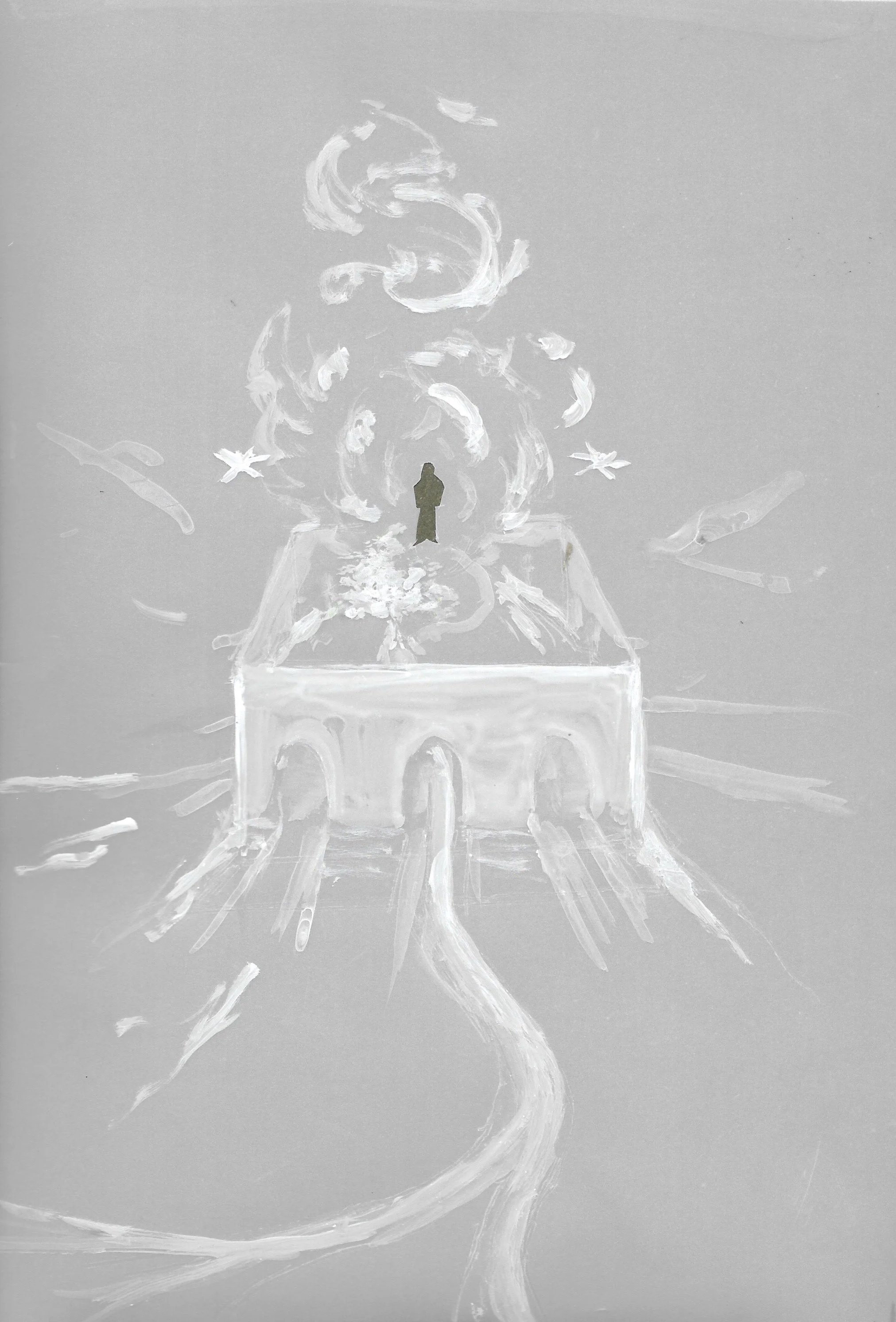 Gouache on vellum overlaid onto charcoal, ink, and color pencil on drawing paper
